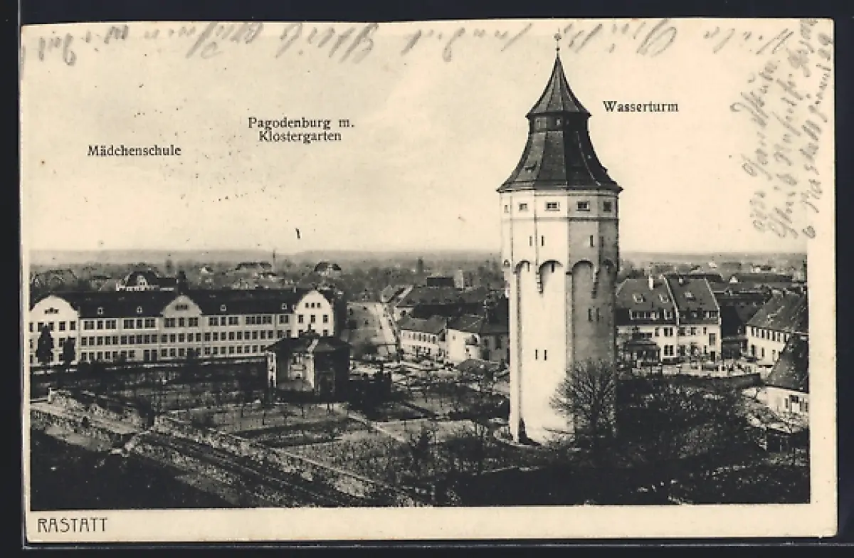 AK Rastatt, Teilansicht mit Mädchenschule, Pagodenburg u. Wasserturm aus der Vogelschau