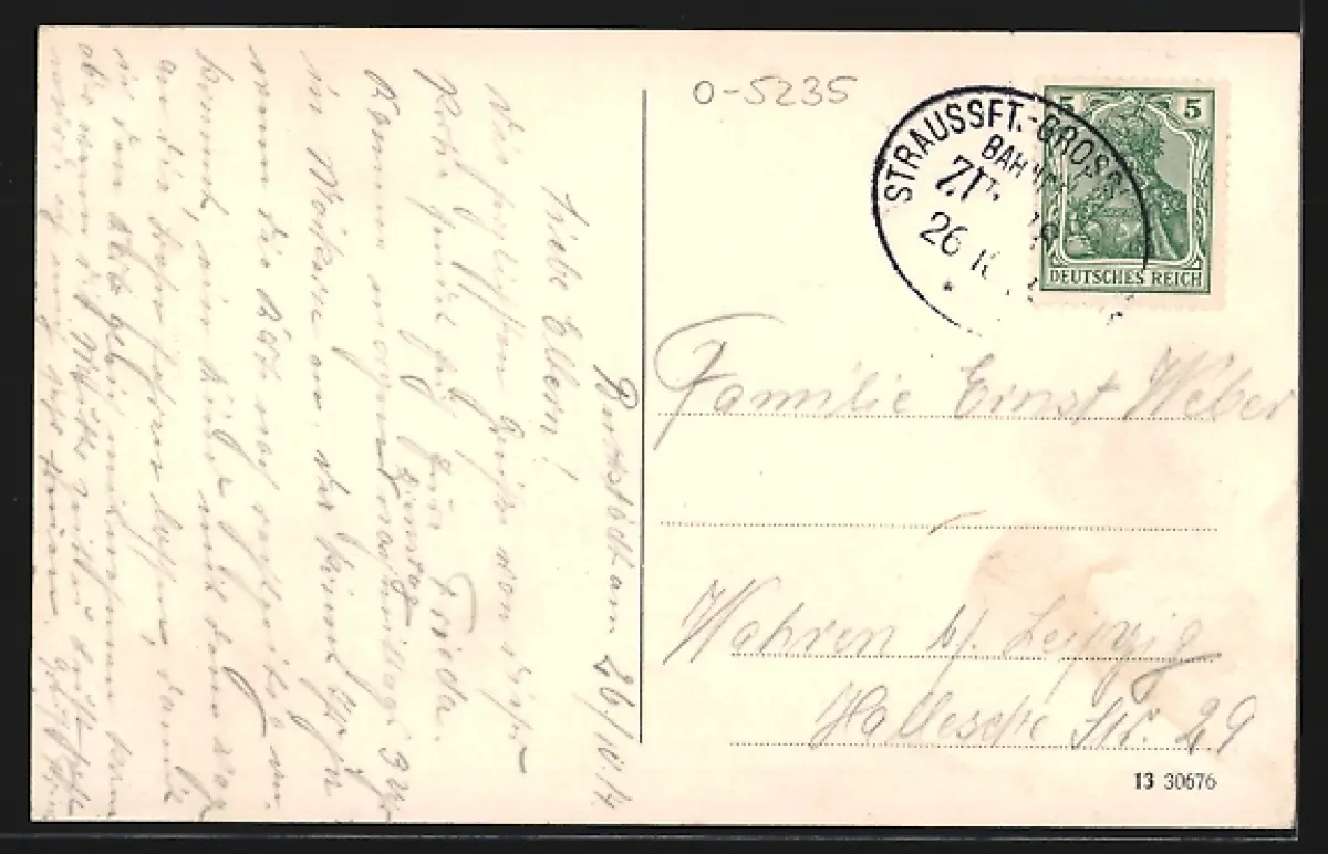 Personenbezogene Daten auf der Rückseite der Karte wurden durch blauen Textmarker unkenntlich gemacht. Die blauen Stellen sind auf die Vorderseite durchgeweicht und wirken sich negativ auf das Postkartenfoto aus