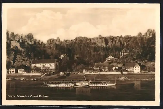 AK Rathen /Sächs. Schweiz, Dampfer Leipzig passiert Ort und Felskulisse