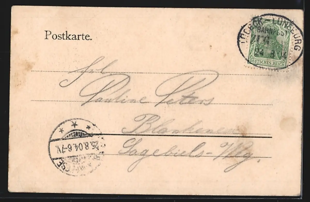 Personenbezogene Daten auf der Rückseite der Karte wurden durch blauen Textmarker unkenntlich gemacht. Die blauen Stellen sind auf die Vorderseite durchgeweicht und wirken sich negativ auf das Postkartenfoto aus