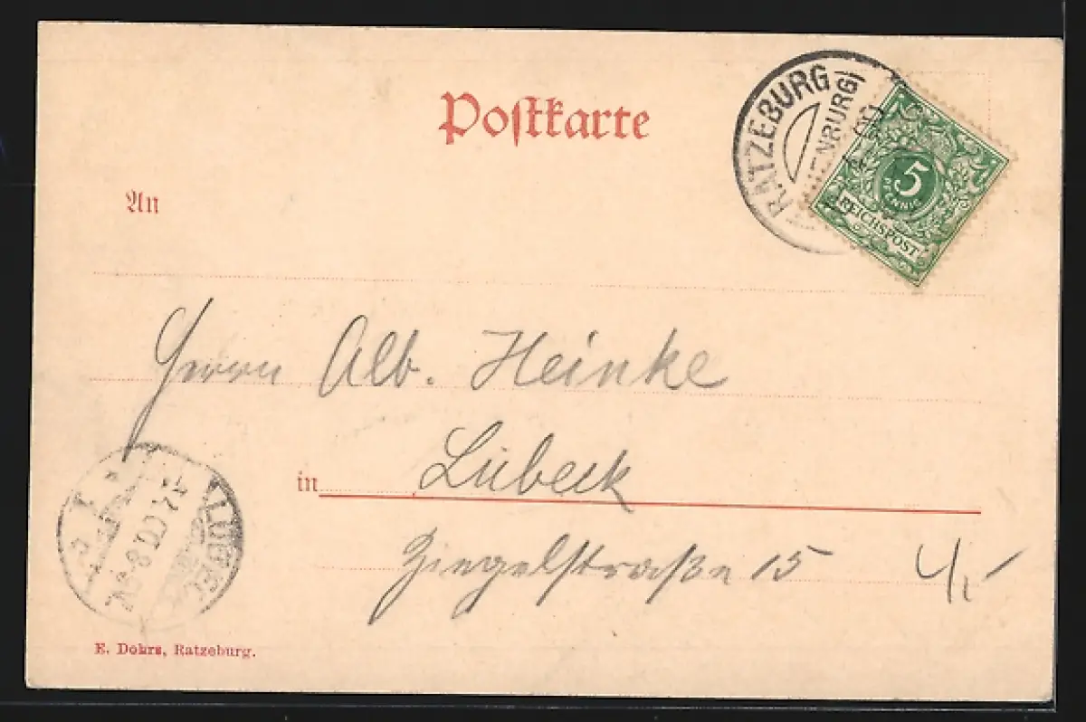 Personenbezogene Daten auf der Rückseite der Karte wurden durch blauen Textmarker unkenntlich gemacht. Die blauen Stellen sind auf die Vorderseite durchgeweicht und wirken sich negativ auf das Postkartenfoto aus