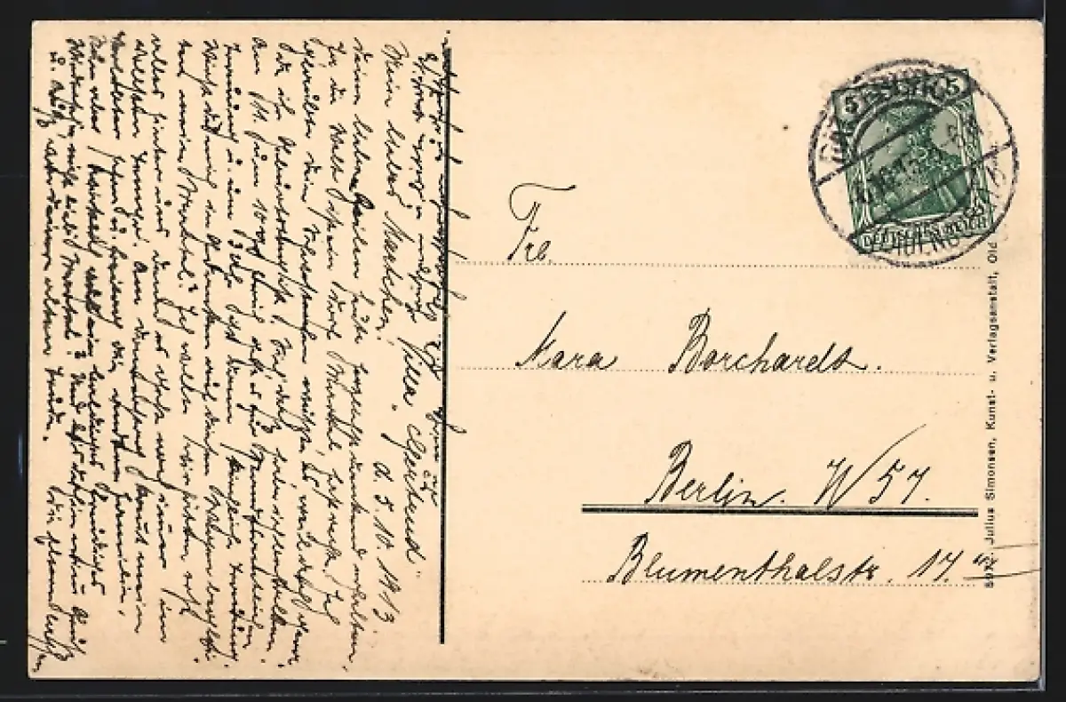 Personenbezogene Daten auf der Rückseite der Karte wurden durch blauen Textmarker unkenntlich gemacht. Die blauen Stellen sind auf die Vorderseite durchgeweicht und wirken sich negativ auf das Postkartenfoto aus