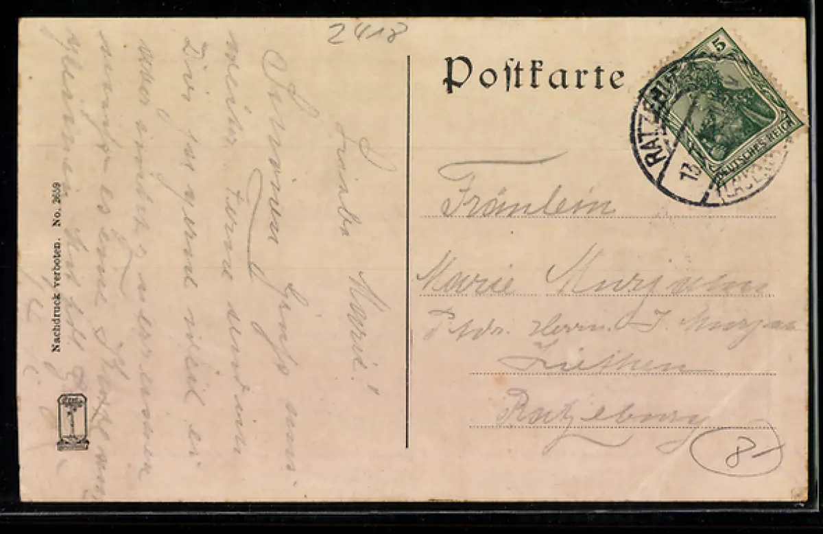 gelaufen 1914, Bugspuren li. unten u. re. mittig, guter Zustand