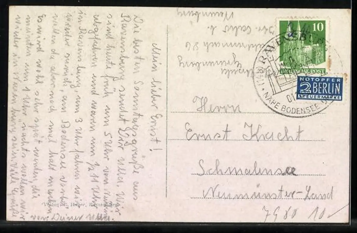 Personenbezogene Daten auf der Rückseite der Karte wurden durch blauen Textmarker unkenntlich gemacht. Die blauen Stellen sind auf die Vorderseite durchgeweicht und wirken sich negativ auf das Postkartenfoto aus