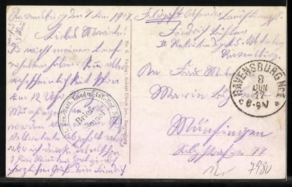 Personenbezogene Daten auf der Rückseite der Karte wurden durch blauen Textmarker unkenntlich gemacht. Die blauen Stellen sind auf die Vorderseite durchgeweicht und wirken sich negativ auf das Postkartenfoto aus