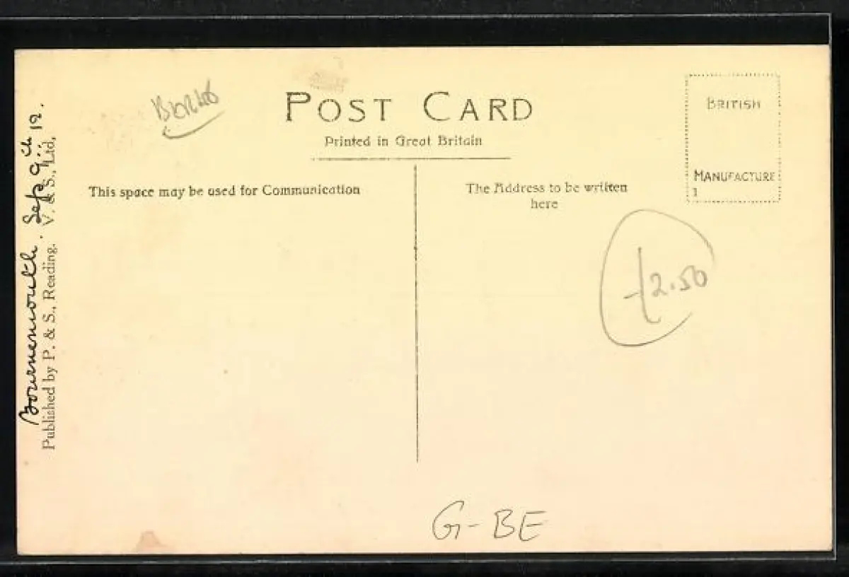 Personenbezogene Daten auf der Rückseite der Karte wurden durch blauen Textmarker unkenntlich gemacht. Die blauen Stellen sind auf die Vorderseite durchgeweicht und wirken sich negativ auf das Postkartenfoto aus