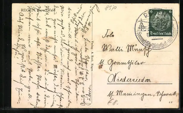 Personenbezogene Daten auf der Rückseite der Karte wurden durch blauen Textmarker unkenntlich gemacht. Die blauen Stellen sind auf die Vorderseite durchgeweicht und wirken sich negativ auf das Postkartenfoto aus