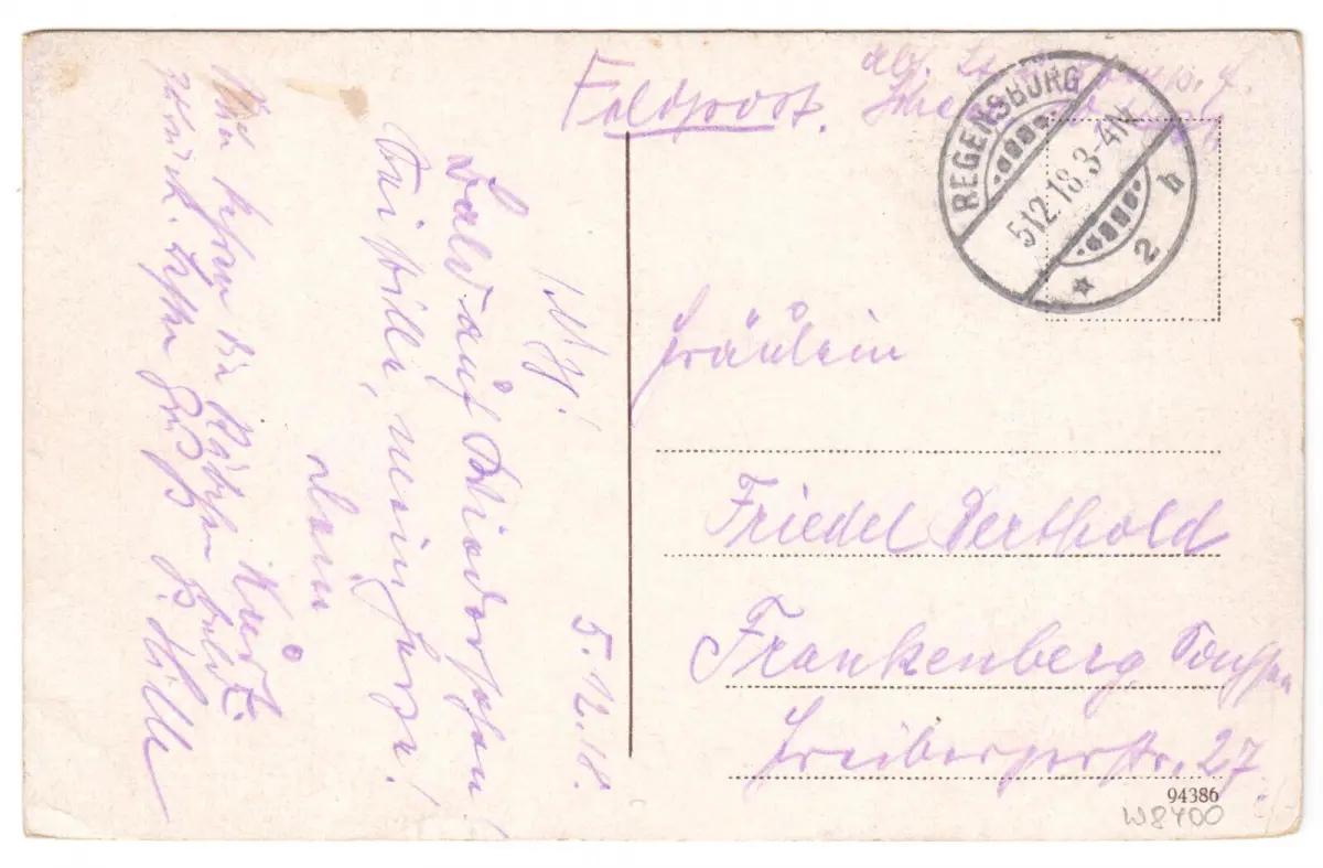 postalisch gelaufen, gestempelt: Regensburg, 5.12.18