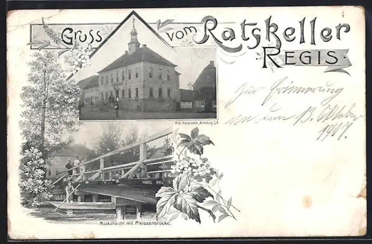 AK Regis, Gasthaus Ratskeller, Rückansicht der Pleissenbrücke