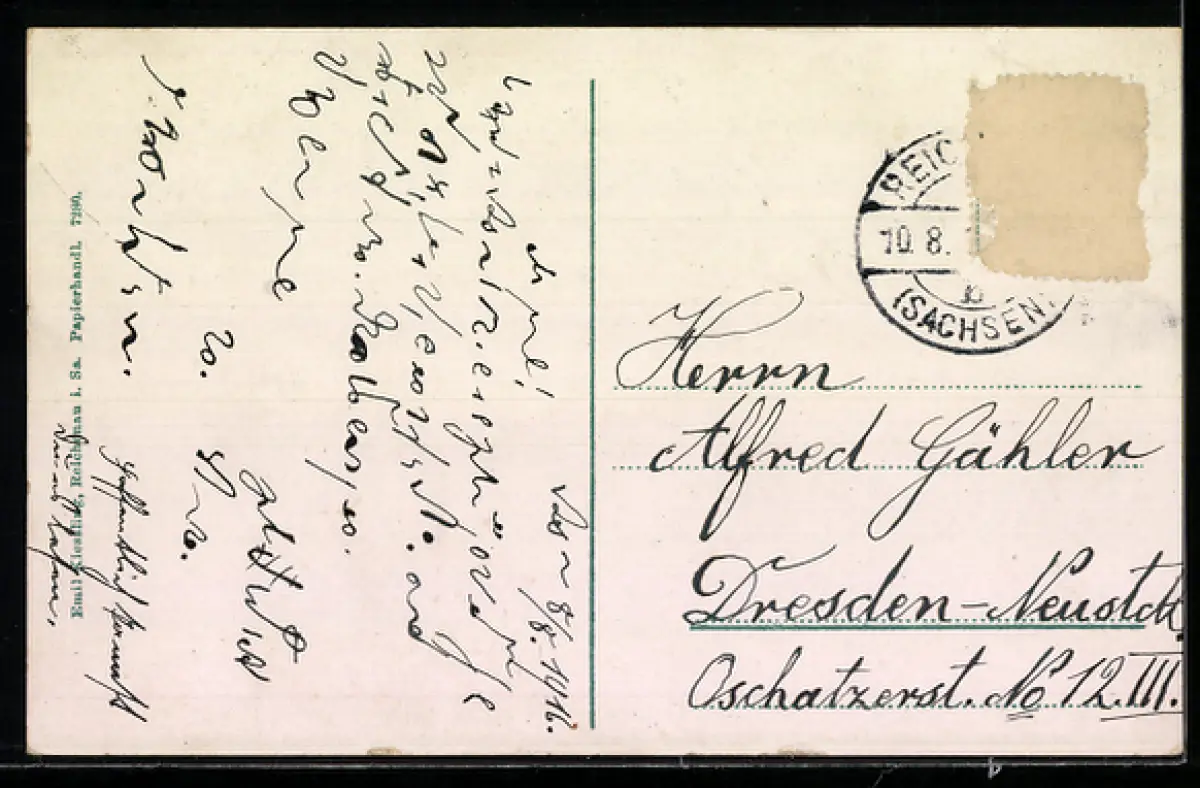 alte Ansichtskarte, gelaufen, Briefmarke entfernt, rückseitig Oberflächenschaden, guter Zustand