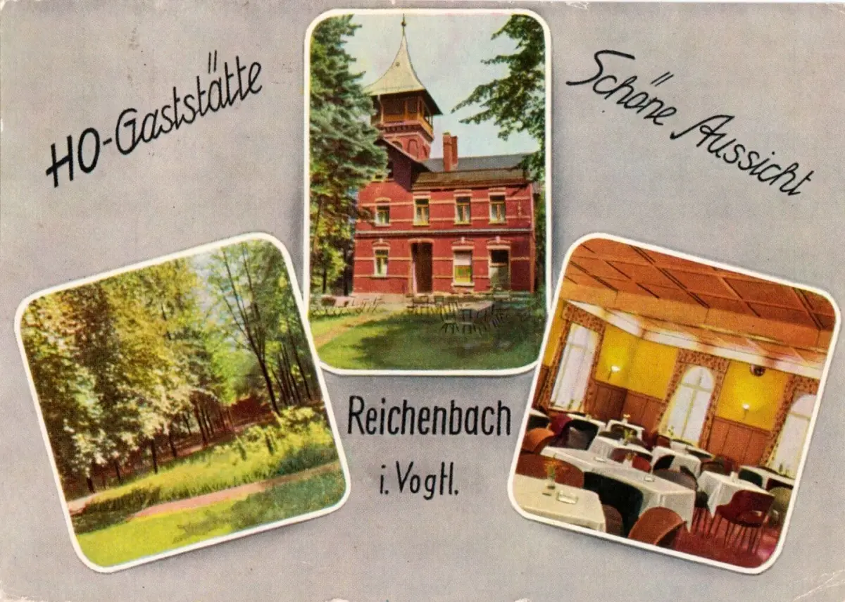 Ansichtskarte Reichenbach i. Vogtl. HOG "Schöne Aussicht", drei Abb., gestaltet Erhaltung I-II postalisch gelaufen, gestempelt: Reichenbach (Vogtl) 1, 23.6.65 Druckvermerk: 1965 Herstellungsland: DDR Verlag: R. Kallmer, Zwickau (Sachsen) - 9831