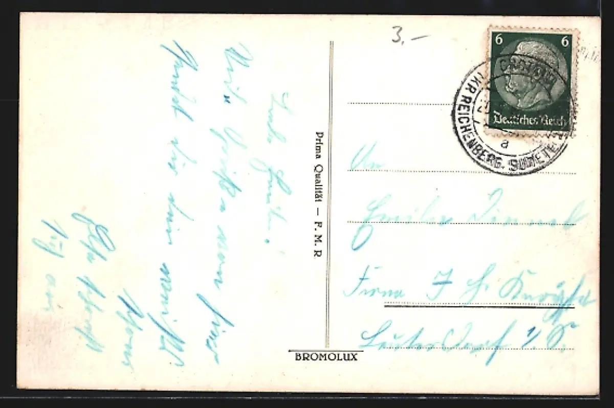 Personenbezogene Daten auf der Rückseite der Karte wurden durch blauen Textmarker unkenntlich gemacht. Die blauen Stellen sind auf die Vorderseite durchgeweicht und wirken sich negativ auf das Postkartenfoto aus