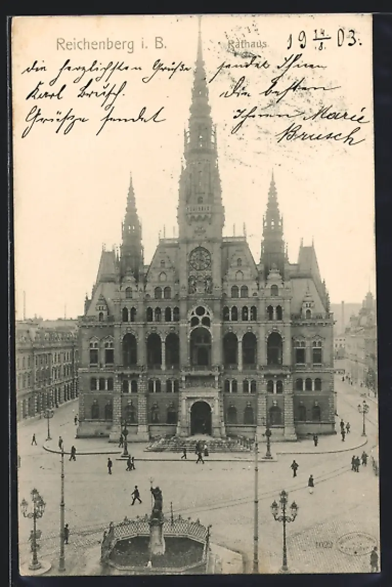 AK Reichenberg i. B., Rathaus mit Passanten