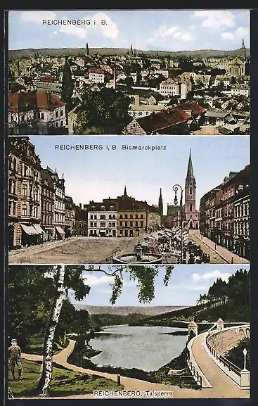 AK Reichenberg i. B., Teilansicht, Bismarckplatz, Talsperre