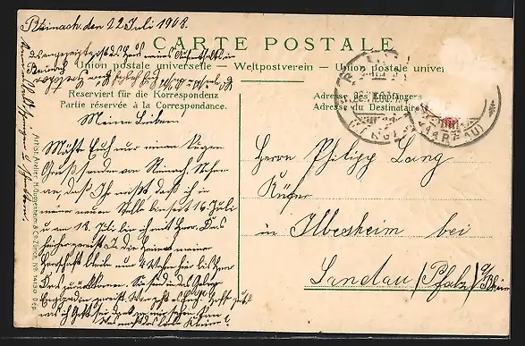 gelaufen 1908, Briefmarke entfernt, guter Zustand