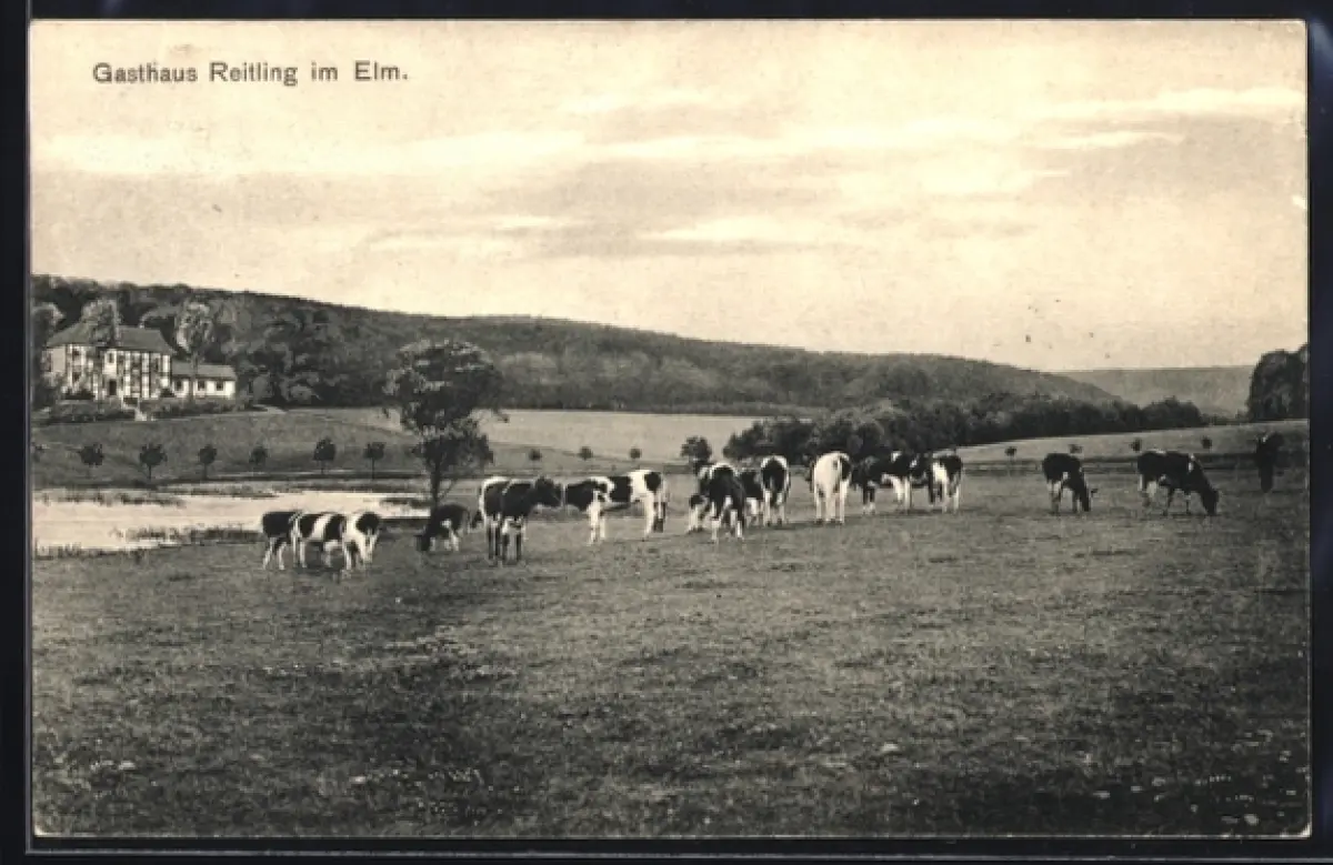 AK Reitling im Elm, Gasthaus Reitling, Weide mit Rindern