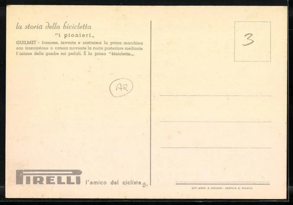 AK Reklame Pirelli, la storia della bicicletta, i pionieri, Guilmet, Radfahrer des Jahres 1868