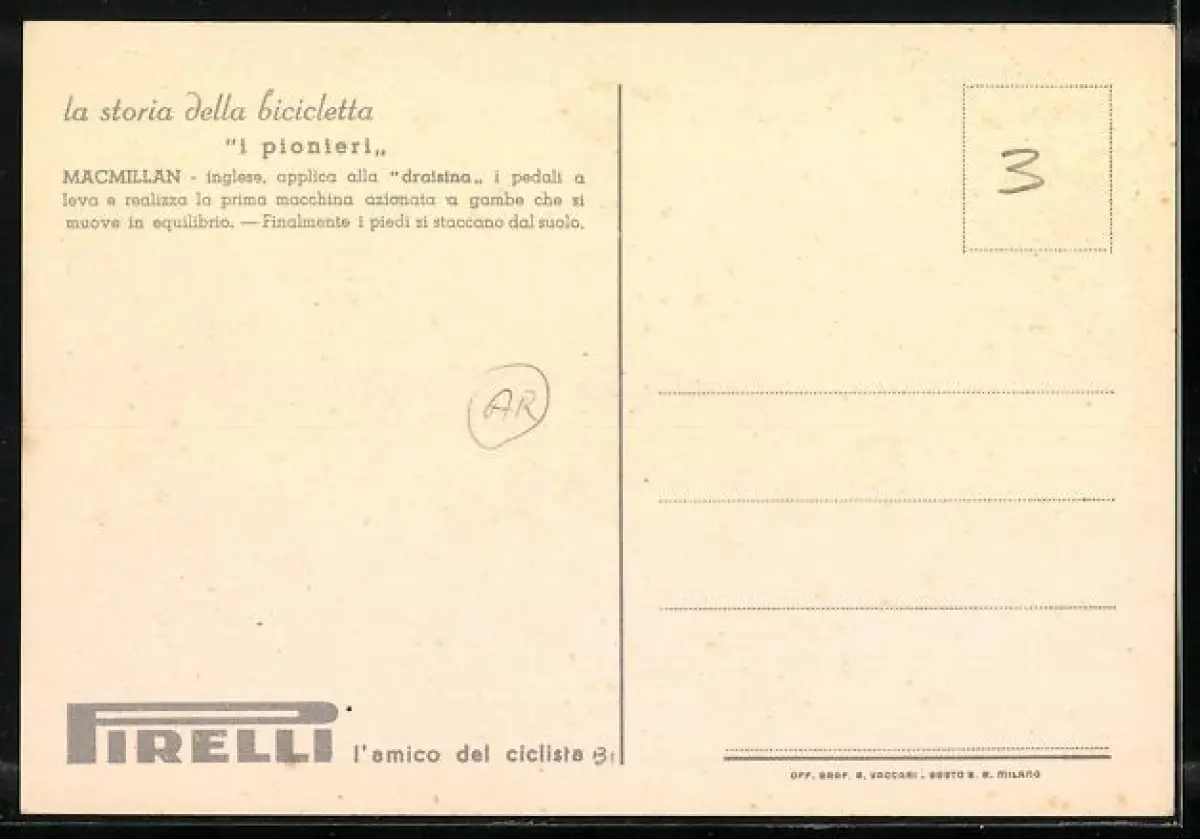 AK Reklame Pirelli, la storia della bicicletta, i pionieri, Macmillan, Radfahrer 1838, Mann mit Zylinder