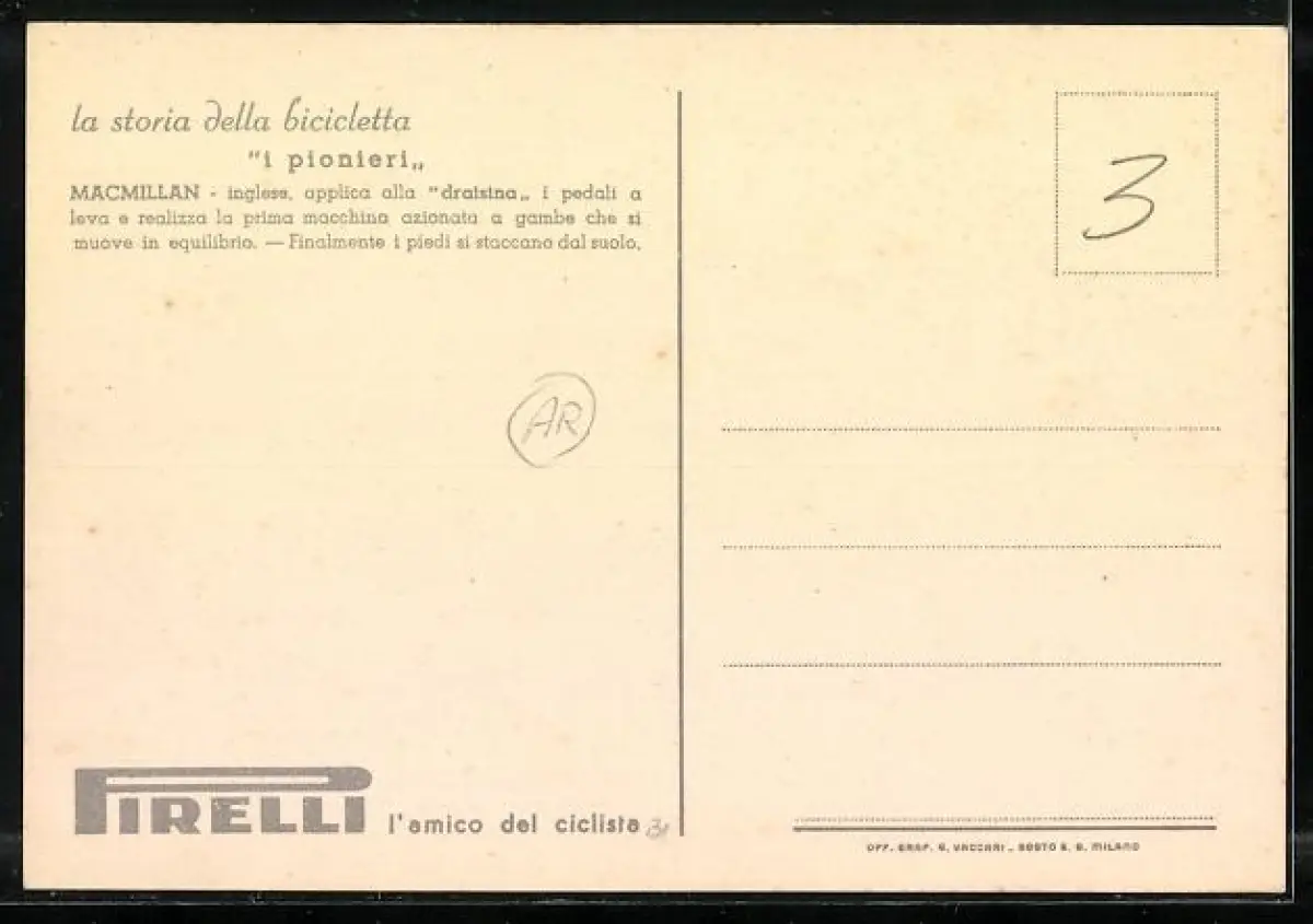 AK Reklame Pirelli, la storia della bicicletta, i pionieri, Macmillan, Radfahrer 1838, Mann mit Zylinder