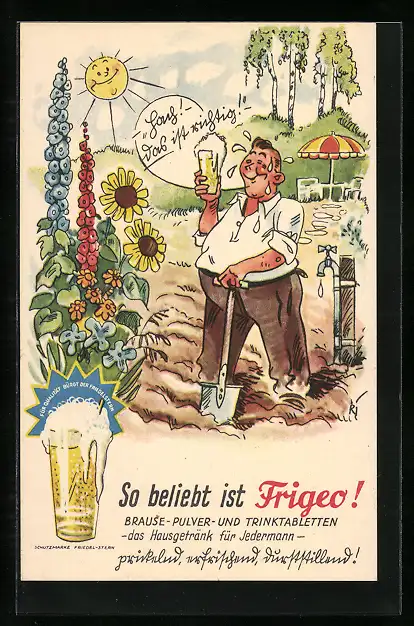 AK Reklame für Frigeo Brause-Pulver, Pause bei der Gartenarbeit mit Frigeo Brause