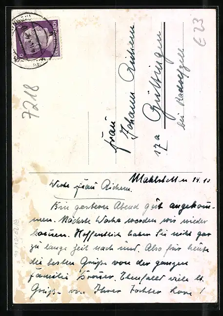 alte Ansichtskarte, gelaufen 1944, rückseitig Oberflächenschaden, Abriebspuren an den Rändern
