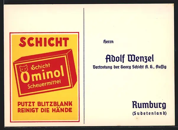 AK Reklame für Ominol Schicht-Scheuermittel, Packung mit Katzenkopf