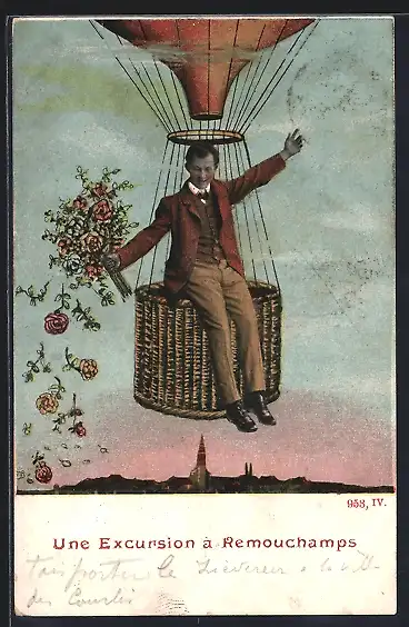AK Remouchamps, Une Excursion, Ballon über der Ortschaft, Herr wirft Rosen ab