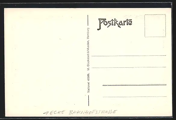 Personenbezogene Daten auf der Rückseite der Karte wurden durch blauen Textmarker unkenntlich gemacht. Die blauen Stellen sind auf die Vorderseite durchgeweicht und wirken sich negativ auf das Postkartenfoto aus