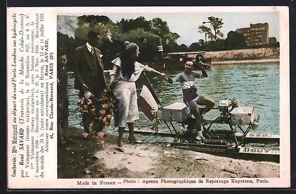 AK Rene Savard auf seinem Tretboot nach Überquerung des Ärmelkanals 1927