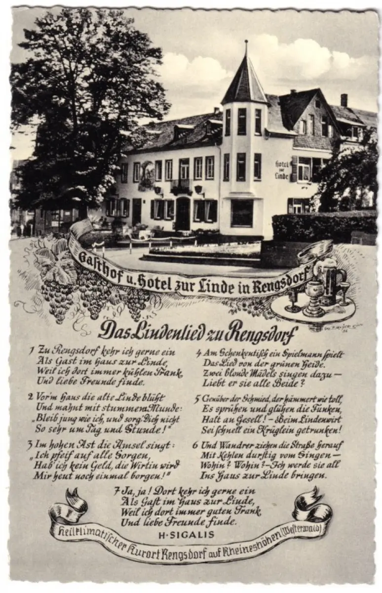 Ansichtskarte Rengsdorf Gasthof und Hotel zur Linde, Liedtext Erhaltung I-II postalisch gelaufen, ungestempelt: [14.5.60] Verlag: H. Zimmermann, Rengsdorf