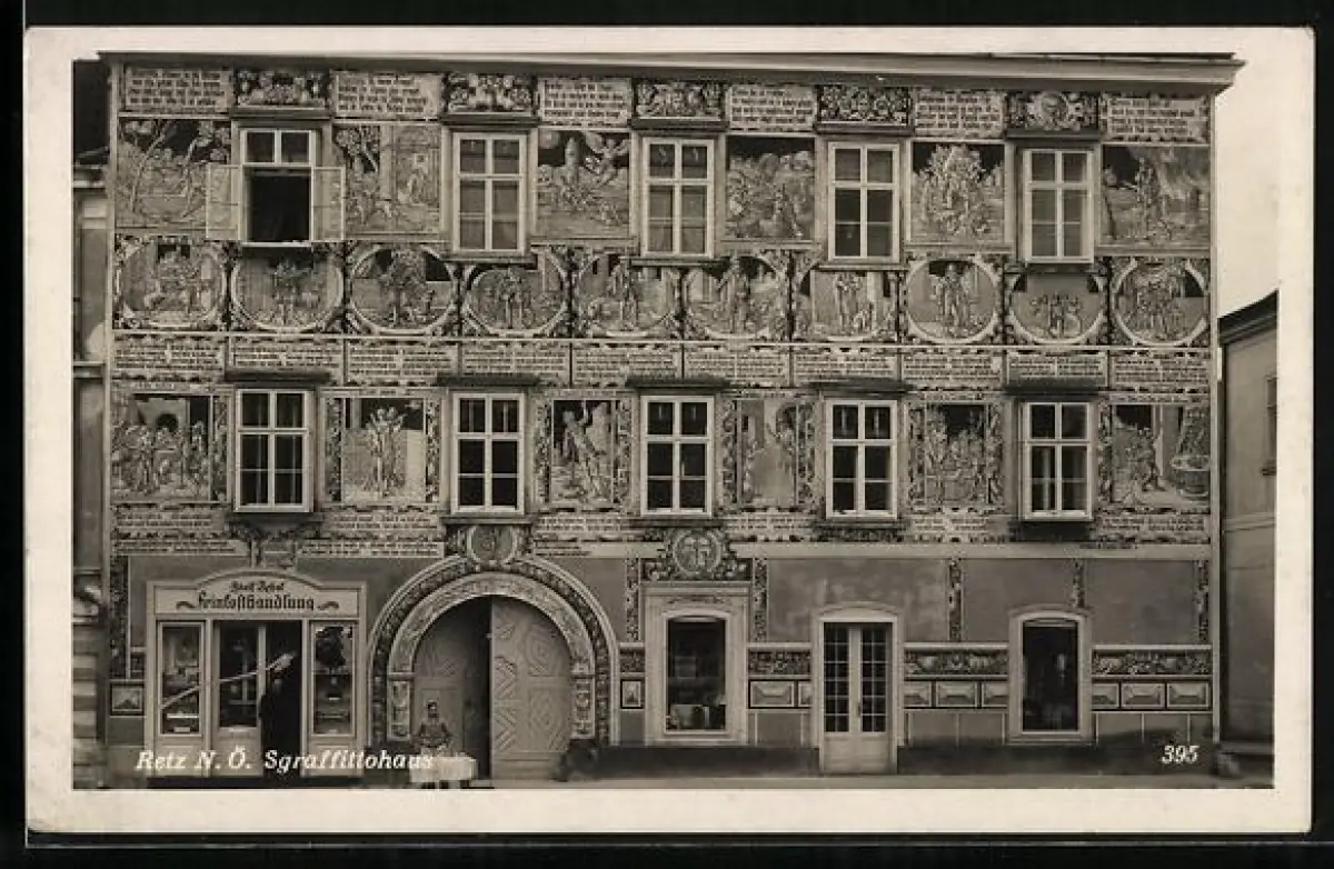 AK Retz /N.-Ö., Sgraffitohaus mit Feinkosthandlung Rebal