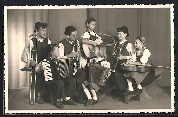 AK Reutte / Tirol, Die Engelkinder mit ihrem Vater Fritz Engel und ihren Instrumenten, Trachtenkapelle