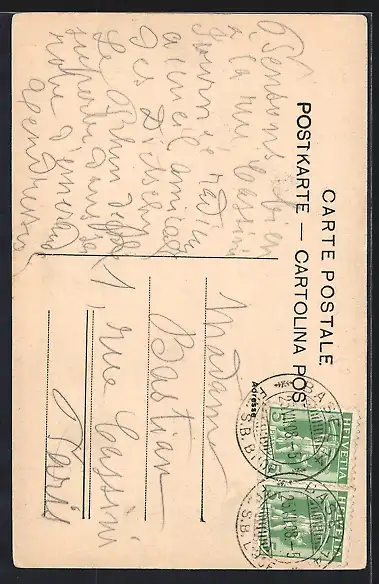 Personenbezogene Daten auf der Rückseite der Karte wurden durch blauen Textmarker unkenntlich gemacht. Die blauen Stellen sind auf die Vorderseite durchgeweicht und wirken sich negativ auf das Postkartenfoto aus