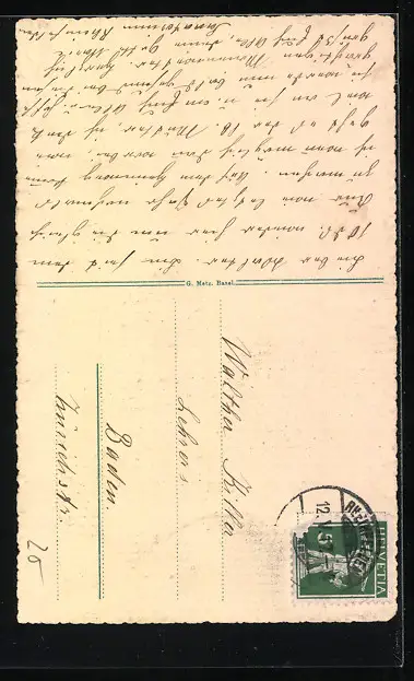 Personenbezogene Daten auf der Rückseite der Karte wurden durch blauen Textmarker unkenntlich gemacht. Die blauen Stellen sind auf die Vorderseite durchgeweicht und wirken sich negativ auf das Postkartenfoto aus