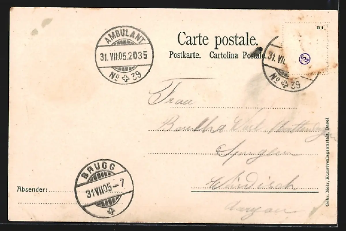 gelaufen 1905, Briefmarke entfernt, guter Zustand