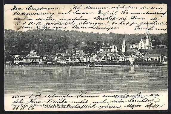 AK Richterswil /Zürichsee, Ortsansicht mit Uferpartie und Kirche