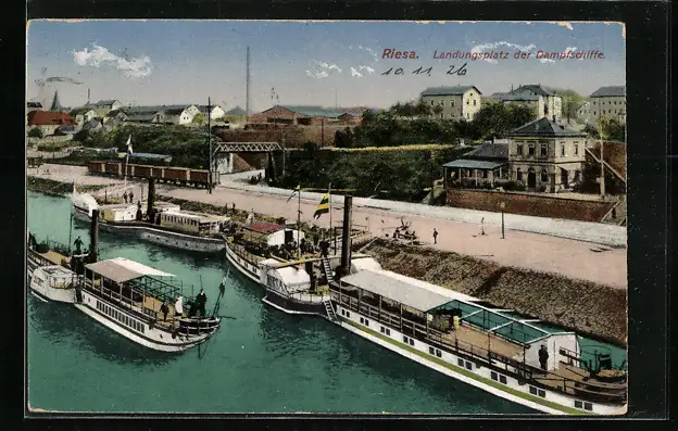 AK Riesa, Landungsplatz der Elbe-Dampfschiffe Riesa u. a.