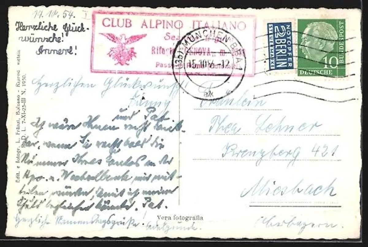 alte Ansichtskarte, gelaufen 1954, Stempelspur, Bugspur unten