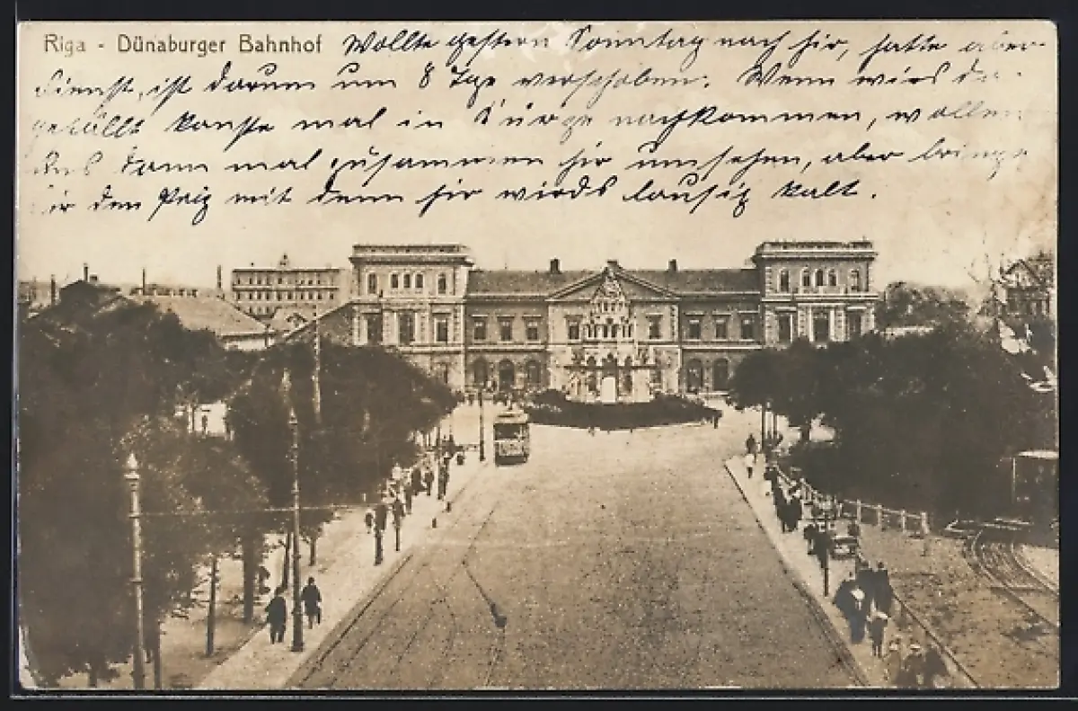 AK Riga, Dünaburger Bahnhof mit Strassenbahn