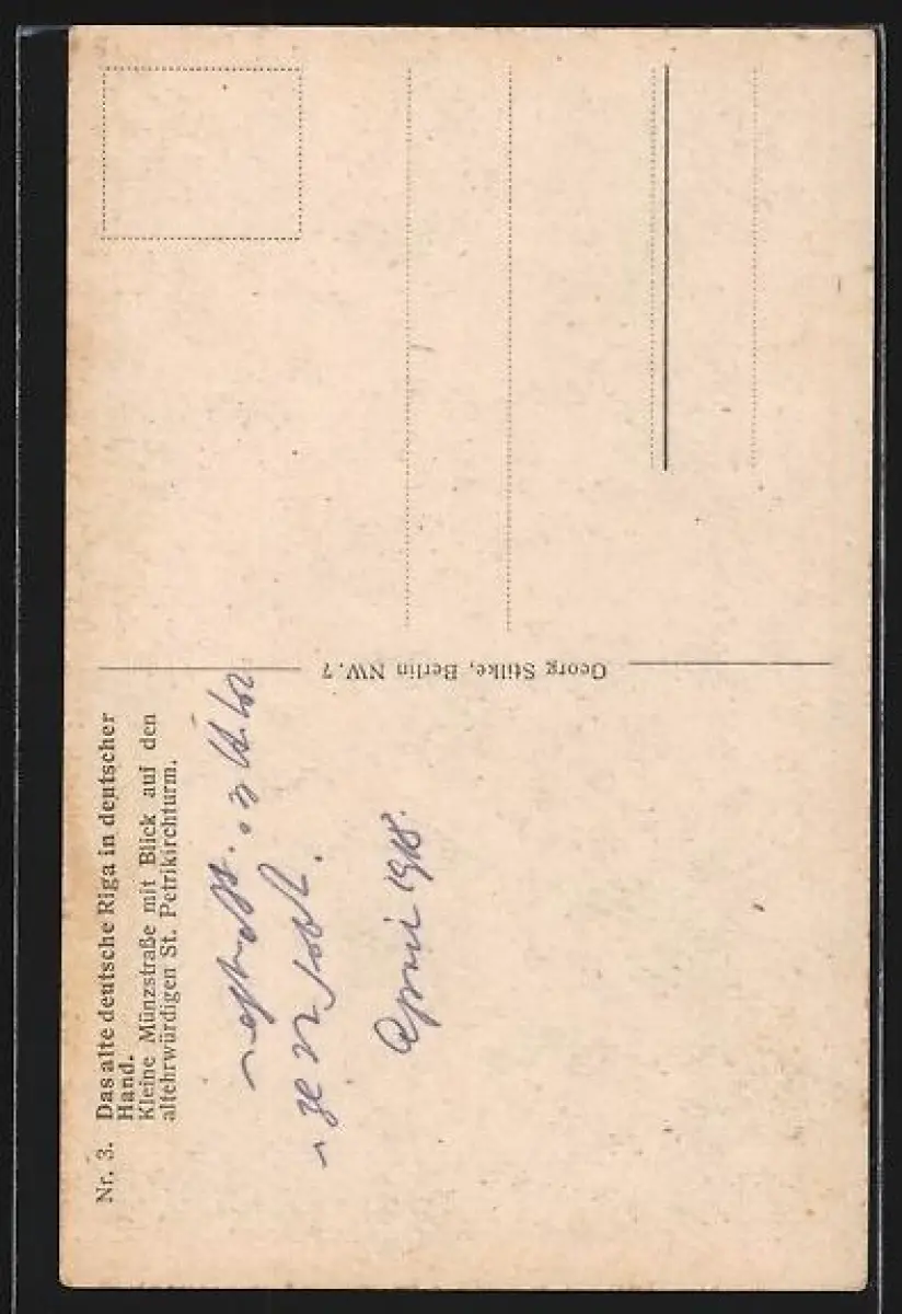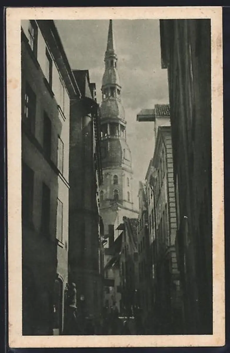 AK Riga, Kleine Münzstrasse mit Blick auf den St. Petrikirchturm
