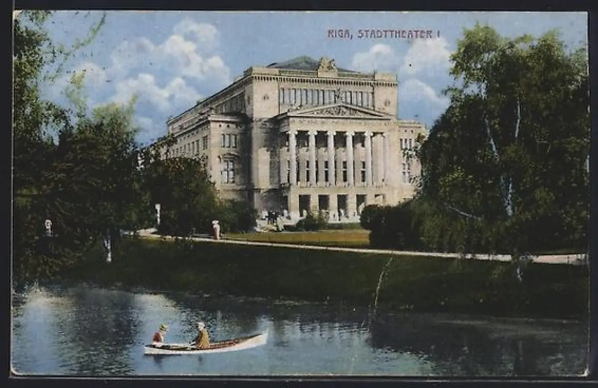 AK Riga, Stadttheater mit Anlagen, Gewässer mit Ruderboot