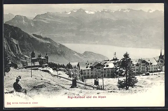 AK Rigi-Kaltbad, Ortsansicht mit Bahnschienen u. Alpen