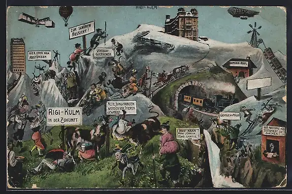 AK Rigi, Ortsansicht in der Zukunft, Munteres Gebirgstreiben, Fluggeräte, Eisenbahnen, Zeppelin