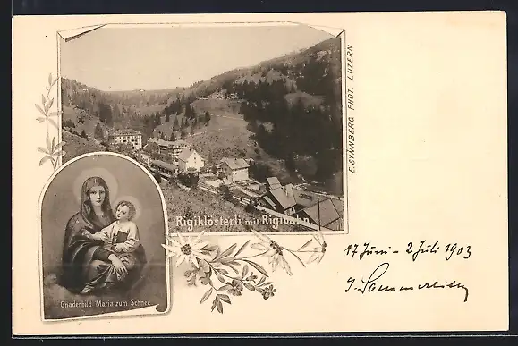 AK Rigiklösterle, Teilansicht mit Rigibahn, Gnadenbild Maria zum Schnee
