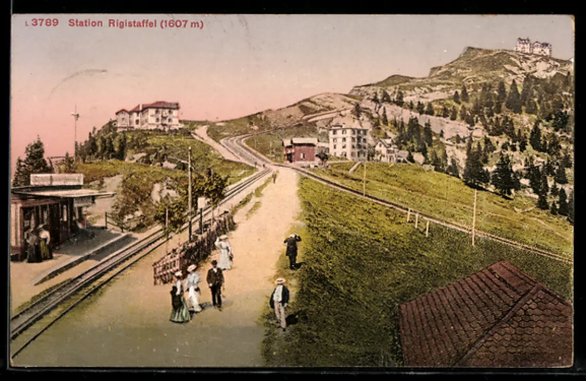 AK Rigistaffel, Bergbahnstation mit Passanten
