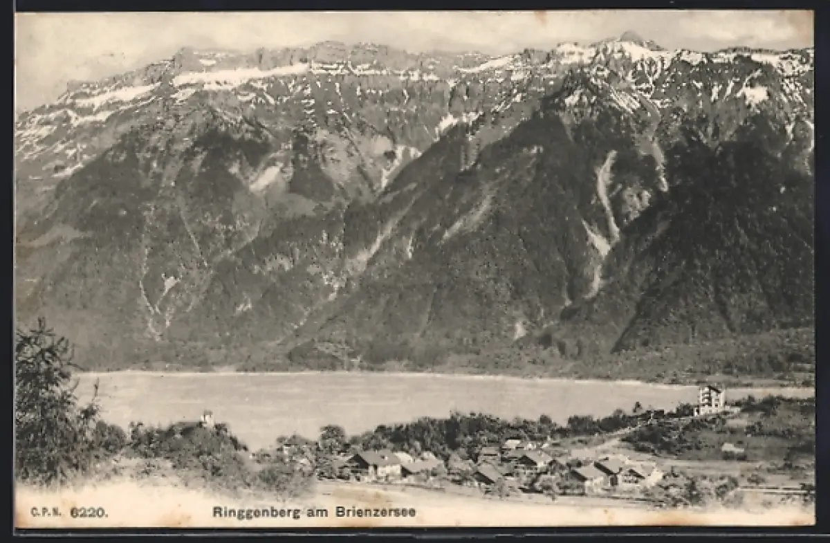 AK Ringgenberg am Brienzersee, Ortsansicht mit See und Bergwand