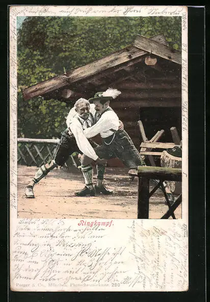 AK Ringkampf, zwei Männer in Trachten beim brüderlichen Wettstreit