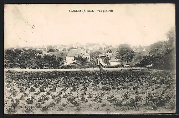 AK Riousse, Nièvre, Vue générale avec un fermier dans un champ