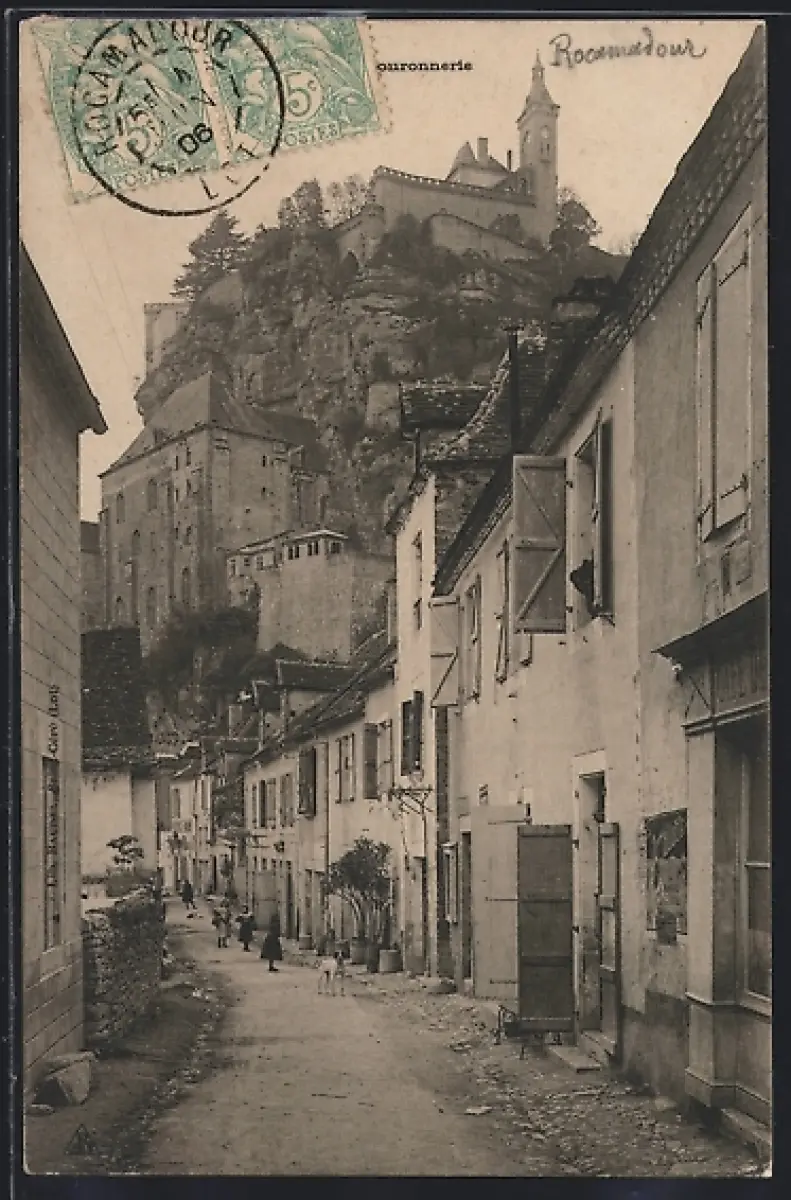 AK Rocamadour, Vue de la rue principale avec le sanctuaire perché sur la falaise