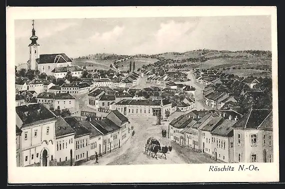 AK Röschitz, Ortsansicht mit Kirche und Kutsche